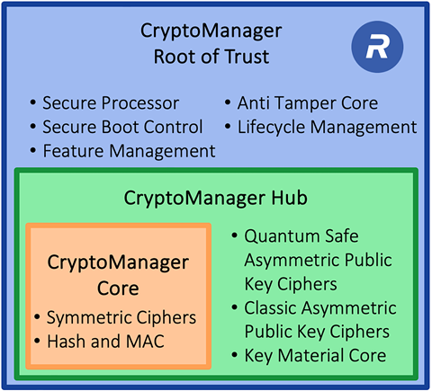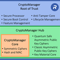 - CryptoManager Hubproducts are the ultimate solution for customers looking to build their own Root of Trust or security processor, ensuring unparalleled protection and performance. CryptoManager Hub products feature a state-of-the-art suite of symmetric, asymmetric, and Quantum Safe cryptographic accelerators along with certified true random number generators designed to meet the highest security standards for a broad set of applications.